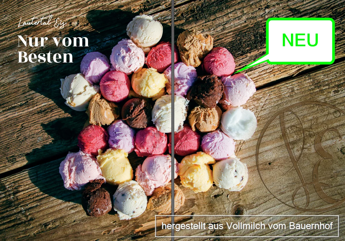 Das Lautertal-Eis mit sorgfältiger Handarbeit und Hingabe, frischer Milch, Joghurt, auserwählten Früchten und Zutaten.